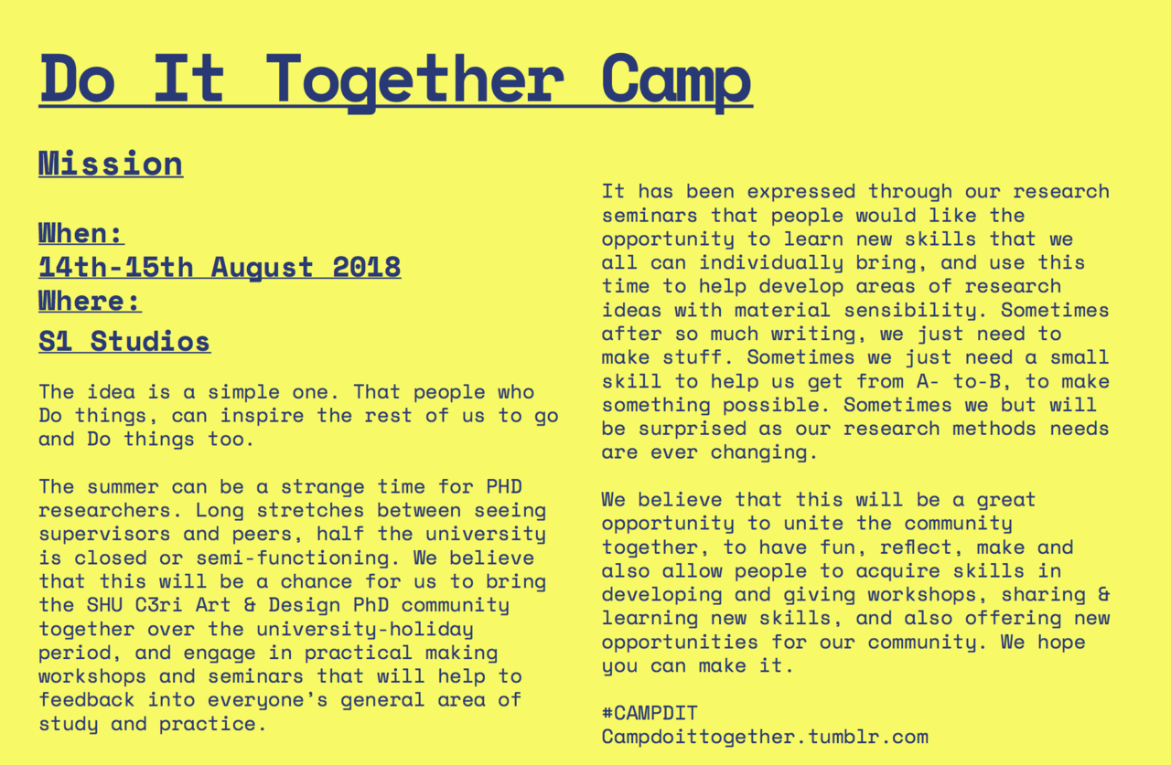 Inspired (& missing) my summer camp days, Anton Hecht & I came up with the idea of a PHD summer camp: Except it would be about skillsharing between us as well as having time to make/be/chat with each other.