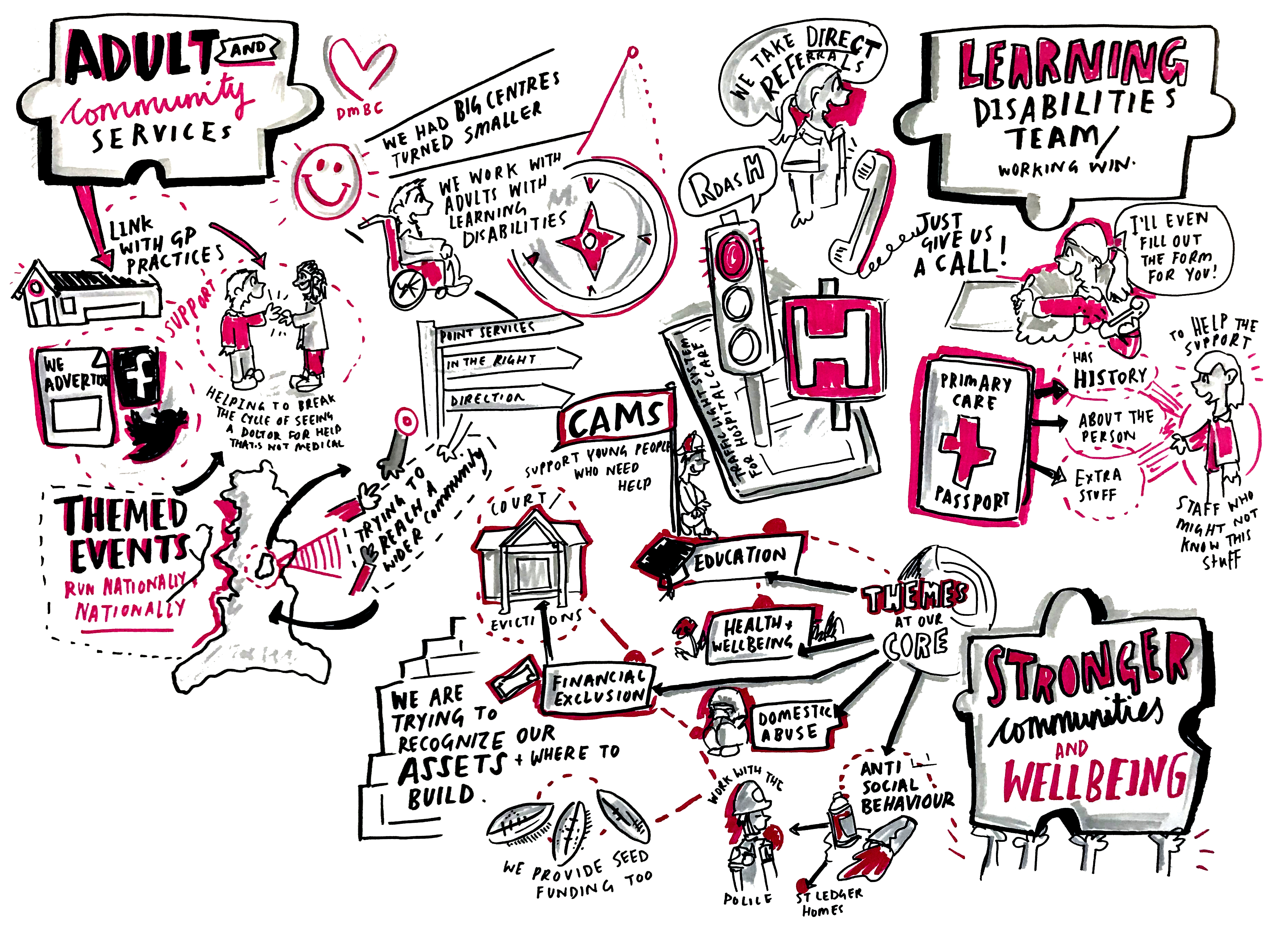 I work across multiple sectors, but do a lot of my drawing within the healthcare sector. Being a qualified healthcare professional helps me to be able to translate a lot of medical terminology, and my indepth understanding of commissioning within the NHS and precurment makes me an ideal artist to be able to translate healthcare stuff to a wider audience.